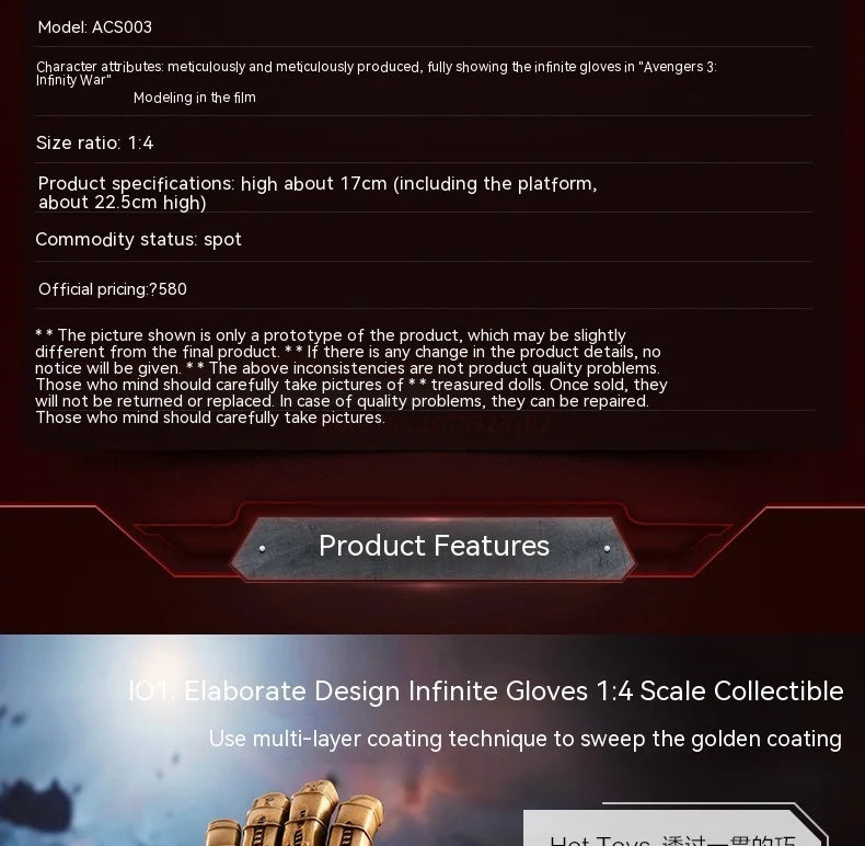 Material and Build: High-quality PVC construction that highlights the gauntlet's elaborate engravings and colors, built to last for avid enthusiasts.